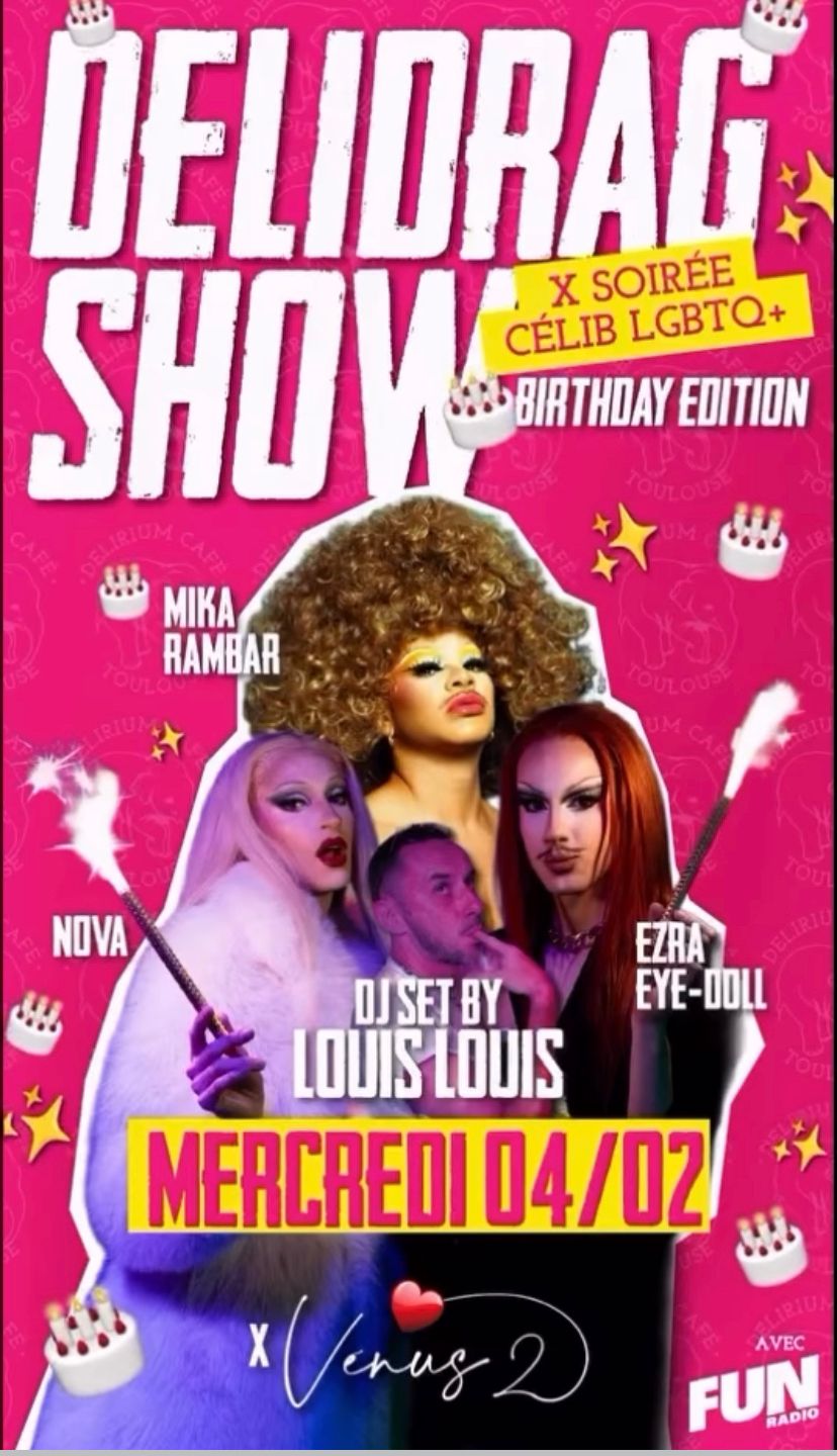 Viens rencontrer ton/ta/tes crush, laisse-toi emporter par un DragShow incroyable avec @the_nova.1, @ezraeyedoll et @mikaa_rambar, DJset de @louis_louis_louisgry et viens profiter des surprises qu’on te réserve ! 🥳 Avec @venus2_toulouse et @funradiotoulouse, nos partenaires de choc, cette soirée célib’ va enflammer la piste et peut-être même ton cœur ! 🔥