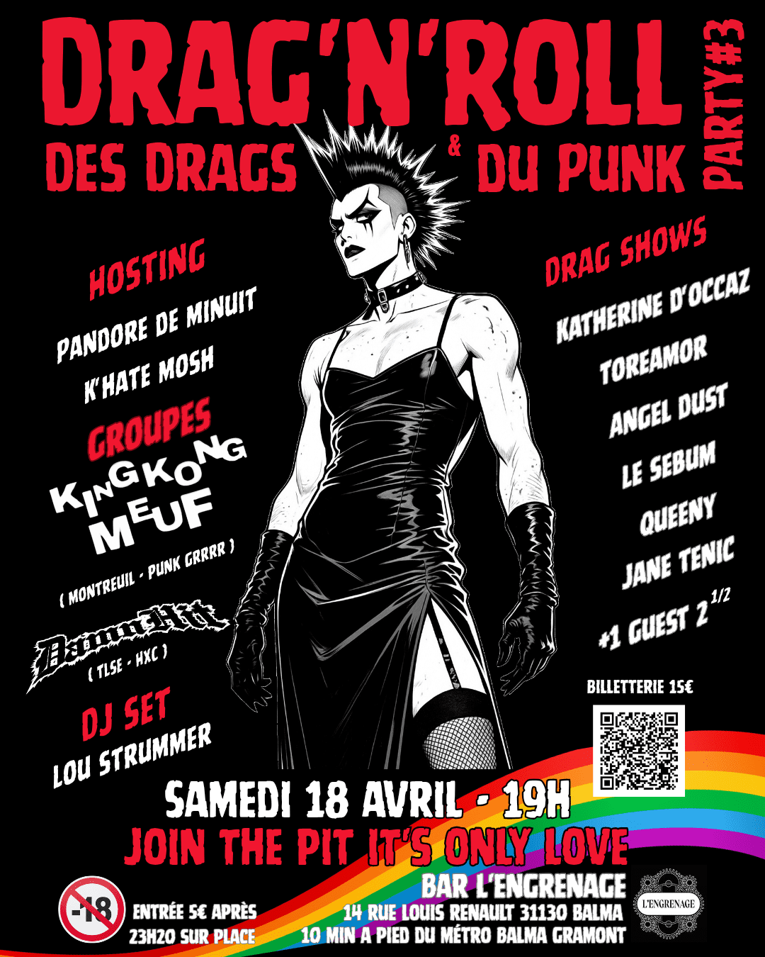 Une soirée rock’n’roll mêlant drags shows et concert live ( punk/rock/metal) Soirée inclusive , ou le respect et la bienveillance sont obligatoire