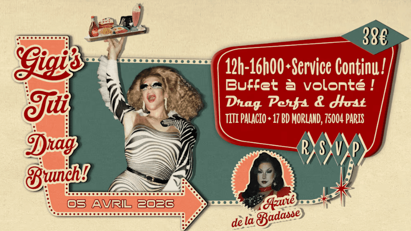 🥠EN 2026, GIGI’S TITI DRAG BRUNCH TOUTES LES DEUX SEMAINES 💕☕ 📅 On se retrouve le dimanche 05 Avril de 12h00 à 16h00 au @titi.palacio ! ✨ Pour cette édition, Gigi accueille la talentueuse, belle et violoniste hors-paire : @azuredelabadasse ! 🌿 Une expérience unique et ultra gourmande vous attend dans une véritable jungle urbaine de 500 m², en plein cÅ“ur du Marais ! Drag shows, jeux, surprises, hostings et performances s’enchaînent autour d’un buffet géant et coloré, installé sur l’un des plus longs bars de Paris ! 📌 INFOS PRATIQUES 🕛 Horaires : 12h00 – 16h00 📠Adresse : Titi Palacio – 17 Boulevard Morland, 75004 Paris ðŸ½ï¸ Buffet à volonté – sucré & salé 💶 Tarifs : 38 € adulte // 19 € enfant (-12 ans) 📞 Réservation recommandée sur : 👉 https://www.titipalacio.com/o/brunch/ 👉 ou au 01 81 22 40 89 🔗 Lien Shotgun : https://shotgun.live/events/gigi-s-titi-drag-brunch-13-au-titi-palacio-azure #dragrace #dragfrance #dragbrunch #localdrag #dragparis