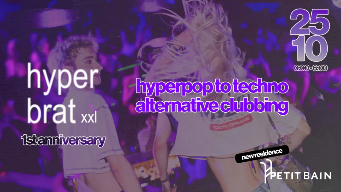 the fusion of hyperpop & techno <3 Hyperbrat xxl : nouveau club, artistes inédits, encore plus hyperbrat, encore plus grand 💋 Pour cette édition anniversaire, un an après la première édition, un nouveau chapitre s'ouvre : Hyperbrat débarque à Petit Bain <3 La barge mythique du 13e arrondissement, au coeur de Paris, is our new residence ! ⭐️ Rooftop, club xxl, soundsystem et lights avancés : the biggest Hyperbrat since the beginning ⭐️ Hyperbrat combine hyperpop & techno pour créer une expérience musicale hybride, à la frontière de ses deux genres musicaux. ⚠ WE'RE NOT A BRAT PARTY NOT CHARLI XCX ONLY NOT MAINSTREAM JUST THE ENERGY OF THE ALBUM 🩵 special guests 🩵 💚 kahi baby s’est imposée sur les plus grandes scènes parisiennes, reine autoproclamée du cunt. entre hyperpop glitchée, edits frénétiques et bangers pop culture, elle incarne l’esthétique y2k dans sa forme la plus excessive. chaque set est un cri, une overdose cunty et de bpm. 🩷 kennymphe navigue entre monde de la nuit et industrie de la mode depuis des années, imposant son univers là où elle passe. dj pour des collectifs iconiques comme la flash cocotte, elle délivre des sets expérimentaux, saturés de bpm, où l’énergie brute se mélange à une esthétique radicale. un voyage sonore intense, sans concession, pour les corps qui veulent brûler le dancefloor. FOLLOW US : https://www.instagram.com/hyperbrat_/ RESPECT 🏳️🌈🏳️⚧️ Hyperbrat est un espace queer, hétéro friendly tant que le respect est de rigueur <3 Chacun et chacune doit impérativement respecter l'espace et l'intimité des autres, il est indispensable que tout le monde se sente en sécurité et en paix durant nos événements. Pour préserver une harmonie et pour que notre public se sente libre d'être soi, nous nous réservons le droit d'entrée. LINE-UP : - kahi baby https://www.instagram.com/kahi_baby/ - kennymphe https://www.instagram.com/kennymphe/ - hyper https://www.instagram.com/hyper.djing?igsh=MWo0YXhhMWZjYWZvNw== - dj baptiste https://www.instagram.com/baptisteslr?igsh=MWVnbDNpbTdkczB0dw==