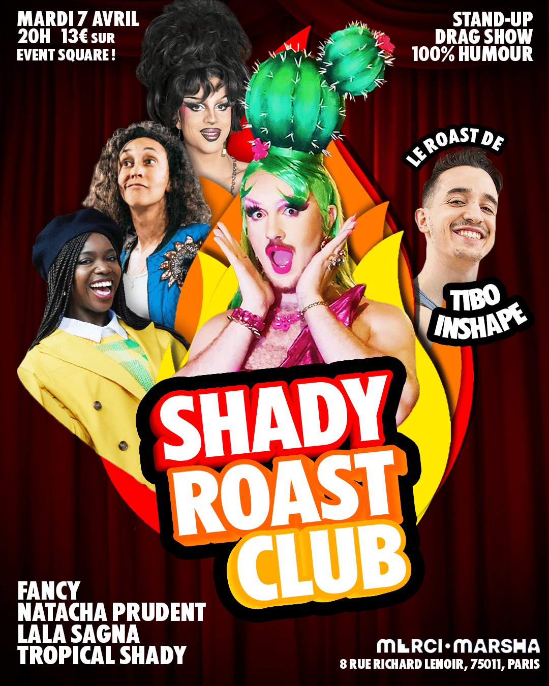 🔥Le Shady Roast Club, c’est LA 1ère soirée 100% humour qui réunit les meilleurs talents du Drag et du Stand-up autour d’une même passion : Roaster des célébrités ! 🔥 UNE PROGRAMMATION VRAIMEEENT… 1ère partie : La Carte Blanche 🎤 Stand-up, Chant, Sketch, Lipsync… vos artistes ont champ libre pour vous faire rire avec la discipline humoristique de leur spécialité. Préparez vos “hihi”, vos “haha” et vos “hoho” (uniquement si vous avez une grosse barbe blanche.) 2ème partie : Le Roast de Tibo InShape 💪 C’est empli d’émotions que vos 4 artistes passent tour à tour au pupitre faire un petit discours pour rendre DOMMAGE, à une célébrité iconique. Les salles de sport n’ont aucun secret pour lui, les bibliothèques municipales un peu plus : cette 2ème édition fera le Roast du youtubeur… Tibo InShape ! UN CASTING VRAIMEEENT… – Lala Sagna, humoriste hilarante, anciennement maîtresse d’école, comédienne et résidente du Point Virgule ! ☀️ – Fancy, drag queen, look queen, imitatrice de Mariah Carey, mais surtout Punk Princess à l’humour décapant ! 🔪 – Natacha Prudent, humoriste cocasse, icône queer, amie de Michel Drucker et résidente de la Comédie des 3 bornes ! ⭐ – Tropical Shady, rayonnante Host de la soirée, Comedy Queen, Reine de Concours et Vierge mais loin d’être vierge. 🌴 Où ? Au Merci Marsha, 8 Rue Richard Lenoir, 75011 Paris. Quand ? Le mardi 7 avril 2026, à 20h ! Combien ? 13€ sur EventSquare !